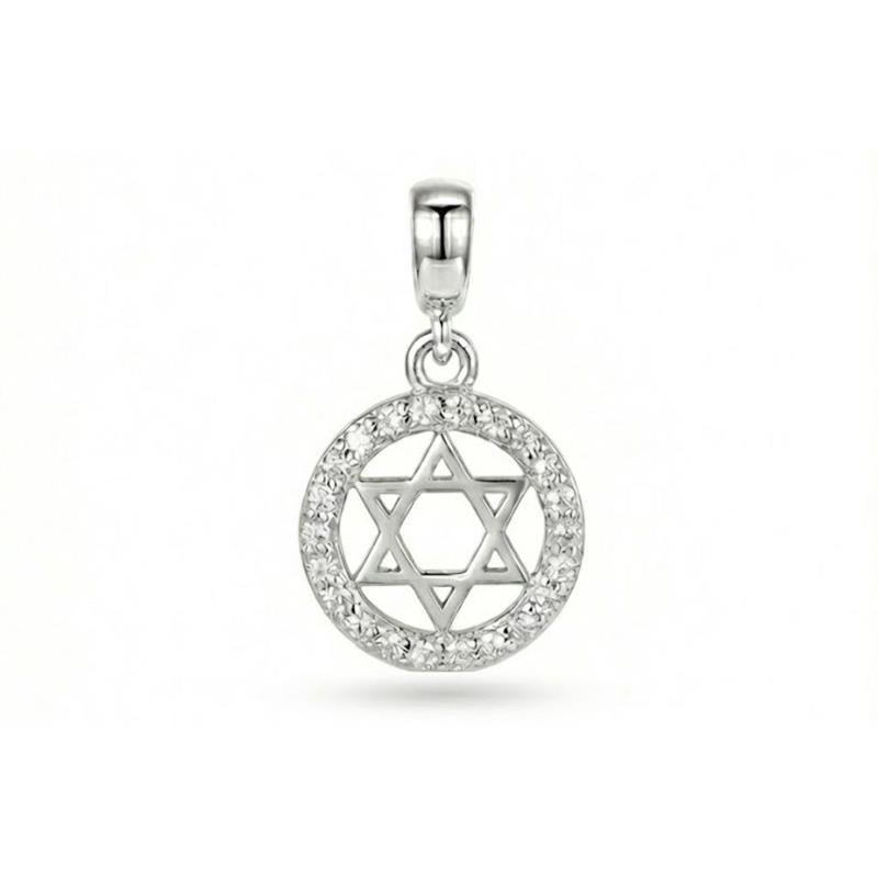 Berloque Estrela de Davi de Prata 925 com zircônias e acabamento polido. Compatível com pulseiras de encaixe universal. Garantia vitalícia contra defeitos de fabricação.